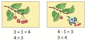 Узнаем, какими знаками в математике обозначают слова: больше, меньше, равно.