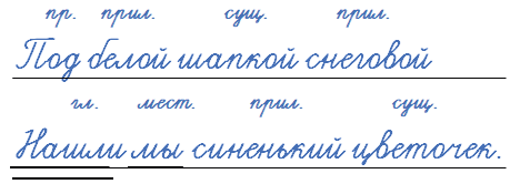 Под (предлог) белой (прил.) шапкой (им. сущ.) снеговой (прил.)