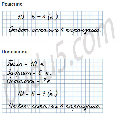 1. В коробке было 10 карандашей. Из коробки взяли 6 карандашей. Сколько карандашей осталось в коробке?