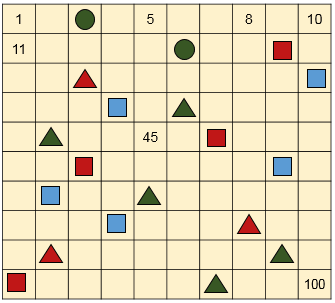 1) Не заполняя полностью таблица числами от 1 до 100, запиши числа, закрытые фигурами.