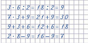| 14 + 35 : 7 = 14 + 5 = 19 | 9 • 2 : 3 = 18 : 3 = 6 |