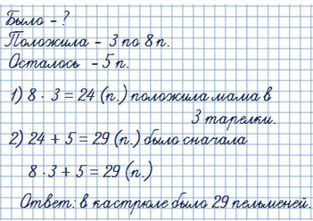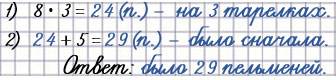 Мама положила пельмени на 3 тарелки, по 8 на каждую, и 5 пельменей осталось в кастрюле. Сколько пельменей было в кастрюле сначала?