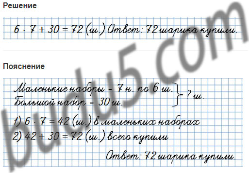 160. Для украшения ёлки купили 7 маленьких наборов шаров, по 6 шаров в каждом, и один большой набор, в котором 30 шаров. Сколько всего шаров купили?