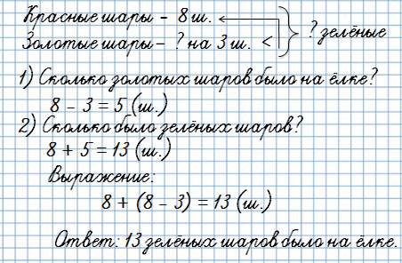 2. На елке было 8 красных шаров, золотых шаров на 3 меньше, чем красных, а зеленых столько, сколько красных и золотых шаров вместе. Сколько было зеленых шаров?