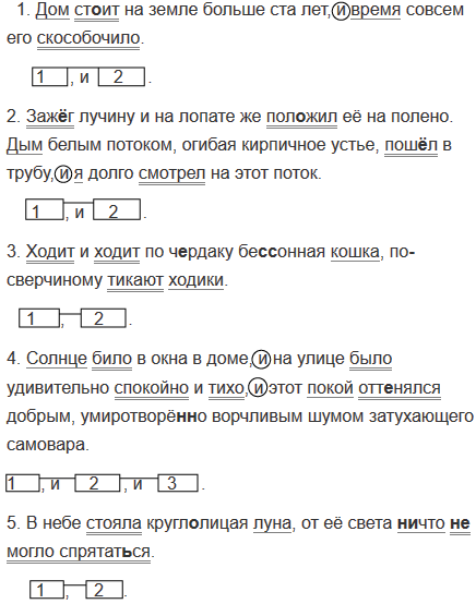 1. Дом ст..ит на земле больше ста лет и время совсем его скособочило. 2. Заж..г лучину и на лопате же пол..жил её на полено. Дым белым потоком, огибая кирпичное устье, пош..л в трубу и я долго смотрел на этот поток. 3. Ходит и ходит по ч..рдаку бе(с, сс)онная кошка (по)сверчиному тикают ходики. 4. Солнце било в окна в доме и на улице было удивительно спокойно и тихо и этот покой отт..нялся добрым, умиротворё(н, нн)о3 ворчливым шумом затухающего3 самовара. 5. В небе стояла кругл..лицая луна от её света (не, ни)что (не)могло спрятат(?)ся.