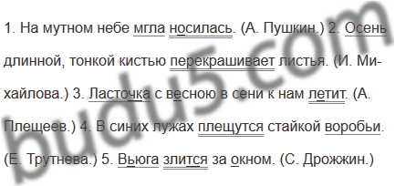 1. На мутном небе мгла носилась. (А. Пушкин.) 2. Осень длинной, тонкой кистью перекрашивает листья. (И. Михайлова.) 3. Ласточка с весною в сени к нам летит. (А. Плещеев.) 4. В синих лужах плещутся стайкой воробьи. (Е. Трутнева.) 5. Вьюга злится за окном. (С. Дрожжин.)