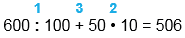 1) 600 : 100 = 6 2) 50 • 10 = 500 3) 6 + 500 = 506 |