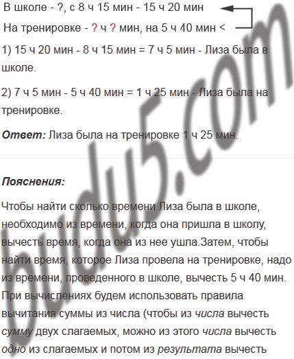 Лиза была в школе с 8 ч 15 мин до 15 ч 20 мин. Вечером она пошла на тренировку. Там она провела на 5 ч 40 мин меньше времени, чем в школе. Сколько времени Лиза была на тренировке?