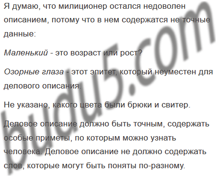 Как вы думаете, удовлетворило ли милиционера такое описание? Почему? Каким требованиям должно отвечать деловое описание внешности человека? Составьте описание, использовав полезные, с вашей точки зрения, сведения из сообщённых мальчиком и добавив недостающие.