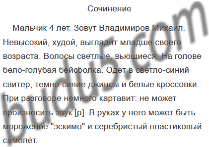 Он маленький. У него светлые кудрявые волосы, озорные глаза. На нём надеты белые носки, брюки и новый свитер. Он ест мороженое «эскимо». Когда он говорит, то немного картавит.