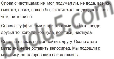 1. Выпишите сначала слова с частицами, а затем слова с суффиксами и приставками в составе местоимений и наречий.