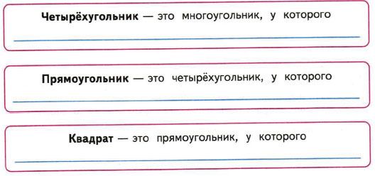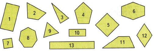1) Выпиши номера всех четырёхугольников. Разбей все четырёхугольники на 2 группы. Подчеркни номера квадратов.