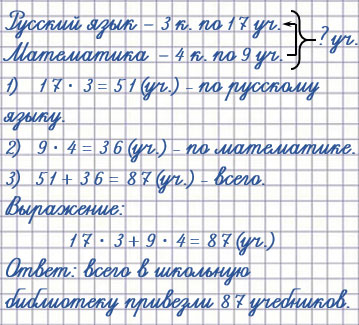 3) В школьную библиотеку привезли 3 коробки с учебниками по русскому языку по 17 учебников в каждой и 4 коробки с учебниками по математике по 9 учебников в каждой. Сколько всего учебников привезли в школьную библиотеку?