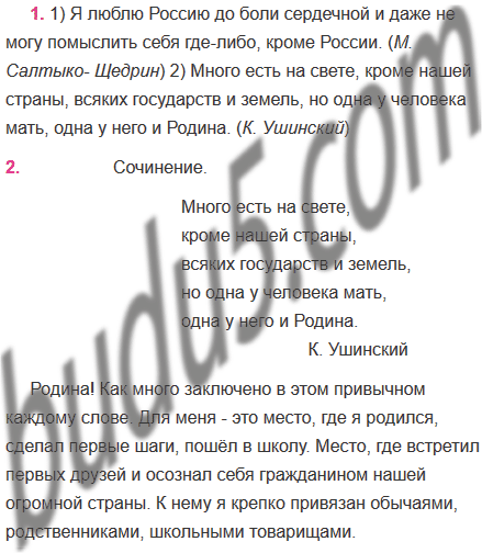 1) Я люблю Россию до боли сердечной и даже не могу помыслить себя где-либо кроме России. (М. Салтыко- Щедрин) 2) Много есть на свете кроме нашей страны всяких государств и земель но одна у человека мать одна у него и Родина. (К. Ушинский)