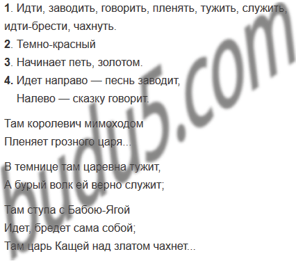 1) Идёт направо — песнь заводит, налево — сказку говорит. 2) Там королевич мимоходом пленяет грозно..о царя. 3) В темнице там ц..ревна тужит, а бурый волк ей верно служит. 4) Там ступа с Бабою-ягой идёт, бредёт сама собой; там царь Кощей над златом чахнет...