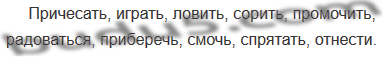 Причесать, играет, ловит, сорить, промочила, радоваться, приберечь, смогла, спрячешь, отнести.
