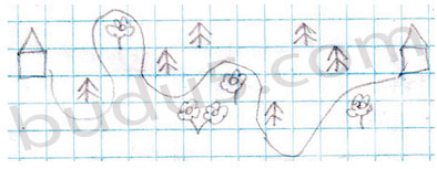 Задание № 7. Проведи тропинку от домика Пятачка к домику Винни-Пуха так, чтобы все ёлочки были слева от неё, а цветы - справа.