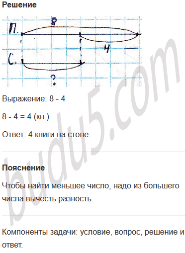 Задание № 3. На полке 8 книг. Это на 4 книги больше, чем на столе. Сколько книг на столе?