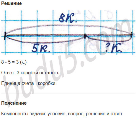 Задание № 2. В магазине на полке лежали 8 коробок карандашей. Из них 5 коробок купили. Сколько осталось карандашей? Какая здесь единица счёта?