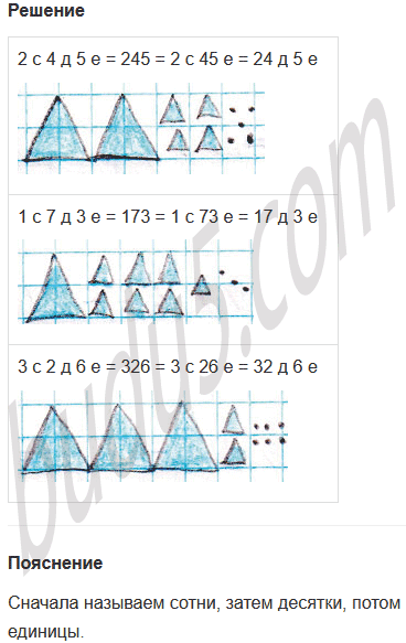 Задание № 2. Запиши и прочитай трёхзначные числа. Нарисуй их графические модели и вырази в разных единицах счёта: