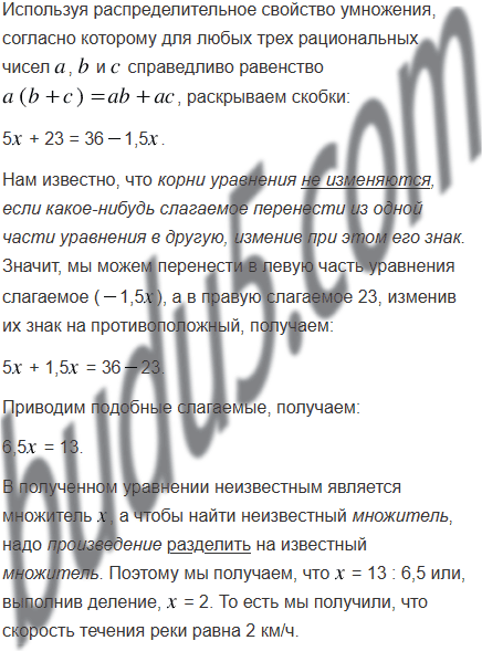 Турист плыл 5 ч на плоту по течению реки и 1,5 ч на моторной лодке против течения. Скорость лодки в стоячей воде равна 24 км/ч. Найдите скорость течения, если против течения турист проплыл на 23 км больше, чем по течению.