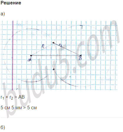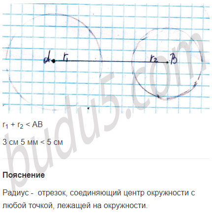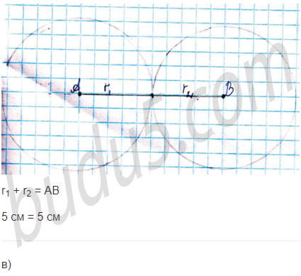 Задание № 10. Построй с помощью линейки отрезок АВ, равный 5 см. Используя циркуль, проведи две окружности с центрами в точках А и В так, чтобы: а) они имели две общие точки; б) они имели одну общую точку; в) они не имели общих точек. Найди сумму радиусов построенных окружностей и сравни её с длиной отрезка АВ. Что ты замечаешь?