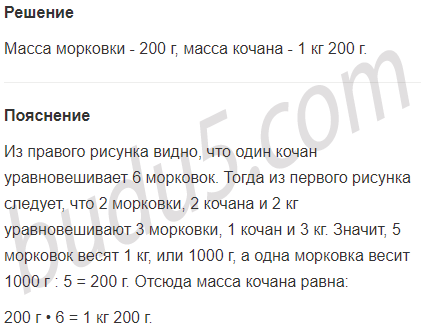 Задание № 12. Используя рисунок, определи, сколько весит одна морковка и сколько весит один кочан капусты? (Масса каждой морковки одна и та же, и все кочаны одинаковые).