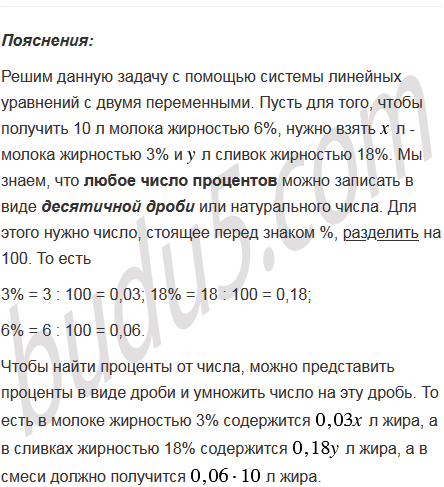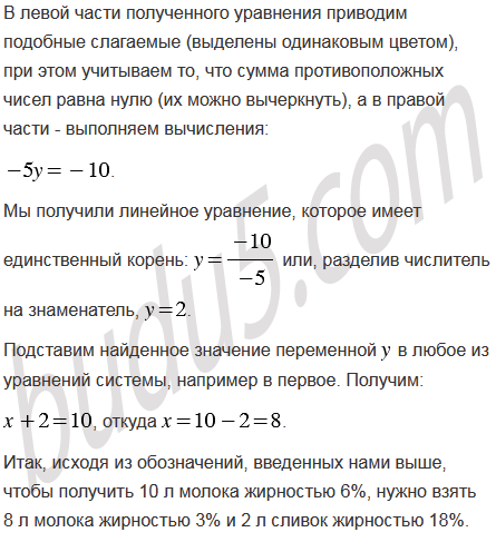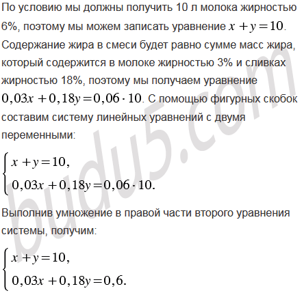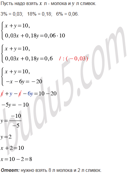 В первом бидоне было молоко жирностью 3%, а в другом - сливки жирностью 18%. Сколько надо взять молока и сколько сливок, чтобы получить 10 л молока жирностью 6%?