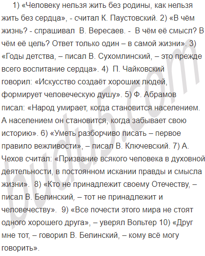 1) Человеку нельзя жить без родины как нельзя жить без сердца. (К. Паустовский) 2) В чём жизнь? В чём её смысл? В чём её цель? Ответ только один в самой жизни. (В. Вересаев) 3) Годы детства это прежде всего воспитание сердца. (В. Сухомлинский) 4) Искусство создаёт хороших людей формирует человеческую душу. (П. Чайковский) 5) Народ умирает когда становится населением. А населением он становится когда забывает свою историю. (Ф. Абрамов) 6) Уметь разборчиво писать первое правило вежливости. (В. Ключевский) 7) Призвание всякого человека в духовной деятельности в постоянном искании правды и смысла жизни. (А. Чехов) 8) Кто не принадлежит своему Отечеству тот не принадлежит и человечеству. (В. Белинский) 9) Все почести этого мира не стоят одного хорошего друга. (Вольтер) 10) Друг мне тот, кому всё могу говорить. (В. Белинский )