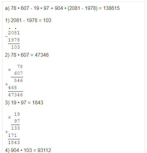 | а) 78 • 607 - 19 • 97 + 904 • (2081 - 1978) |