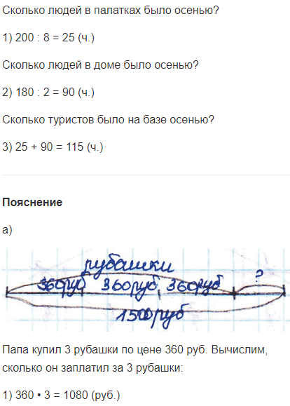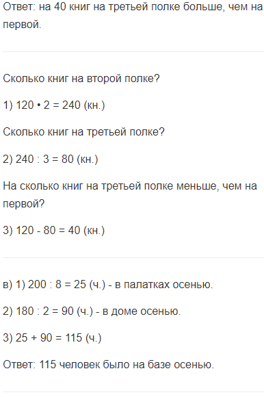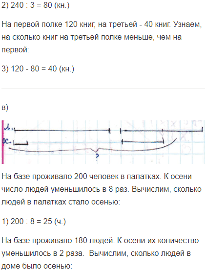 в) На туристической базе летом проживало 200 человек в палатках и 180 человек в доме. К осени число людей в палатках уменьшилось в 8 раз, а в доме - в 2 раза. Сколько туристов было на базе осенью?