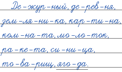 Выпишите из словарика "Пиши правильно" десять трёхсложных слов, разделяя их на части для переноса.