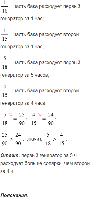 Один генератор израсходует бак солярки за 18 ч непрерывной работы, а другой - за 15 ч. Какой генератор израсходует больше солярки: первый за 5 ч или второй за 4 ч?