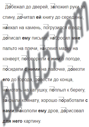 Д..бежал до дверей, з..ложил руки за спину, д..читал книгу до середины, н..ехал на камень, погрузился в воду, д..писал письмо, н..бросил пальто на плечи, н..клеил марку на конверт, п..говорили о погоде, п..сидели на лавочке, д..везти до города, д..вести до конца, н..мотать на катушку, п..плыл к берегу, з..крыли комнату, хорошо п..работали, н..кололи дров, д..рисовал картину.