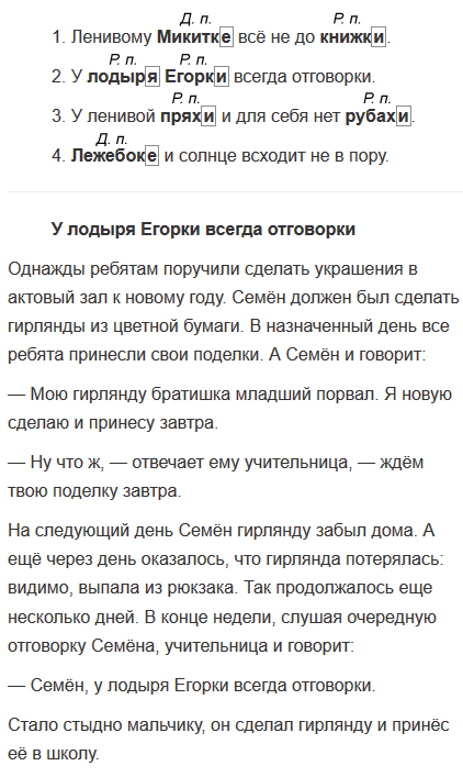 1. Ленивому, всё, книжка, Микитка, не, до. 2. Лодырь, Егорка, у, отговорки, всегда. 3. Ленивой, пряха, у, и, рубаха, для, себя, нет. 4. Лежебока, не, и, солнце, всходит, в, пору.