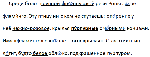 Среди болот крупной фр_нцузской реки Роны ж_вет флами́нго. Эту птицу ни с кем не спутаешь: оп_рение у неё нежно-розовое, крыл_я пу́рпурные с ч_рными концами. Имя «фламинго» озн_чает «огнекрылая». Стая этих птиц л_тит, будто белое обл_ко, подкрашенное пурпуром.