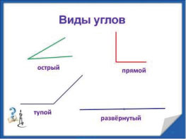 Мы узнаем, что углы бывают, острыми, прямыми и тупыми.