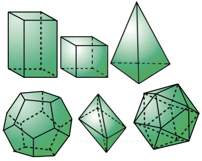 Многогранник - это поверхность, составленная из многоугольников. Грани многогранника - это многоугольники, из которых он составлен. При этом никакие две соседние грани многогранника не лежат в одной плоскости. Стороны граней - это рёбра многогранника, а их концы - это его вершины. На рисунке ниже изображены многогранники.